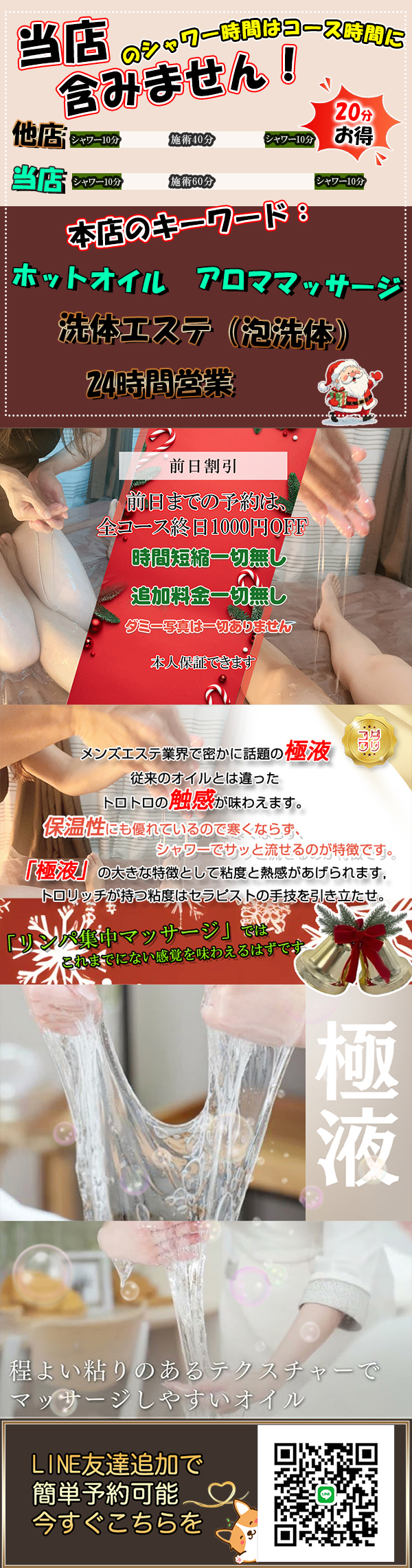 NEW SHOP!!! 2026/01/13 当店では、アロマオイルの効能と当店自慢のセラピストによるリンパマッサージの相乗効果による、癒しのひとときをお客様お一人お一人にお届けしております、自然で心やすらぐ優美な香りを、施術中はもちろんご帰宅お休みになってから翌日朝目覚めでまで楽しんで頂けます、どうぞゆっくりご堪能ください。